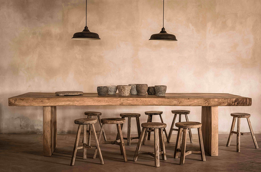 4 – Privilegia-se o uso de materiais naturais (madeira envelhecida, pedra esfarelada, barro, lã, algodão cru, linho, papel de arroz…) em vez de materiais artificiais e/ou luxuosos (plástico laminado, mármore polida, placa de vidro, porcelana, poliéster, licra…).